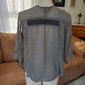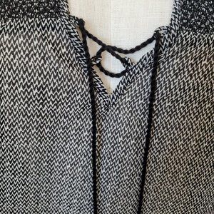 American Eagle Outfitters, chevron print, sheer tunic. Bohemian style, relaxed fit, round hem, with criss cross tassel tie on the neck. 3/4 sleeves. Black and white chevron pattern, smocked back strip and on the front. Size M. Condition is excellent!