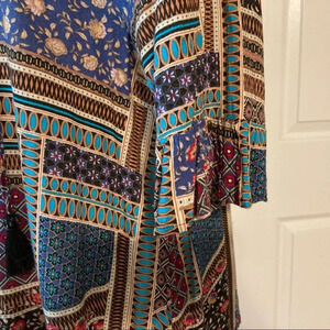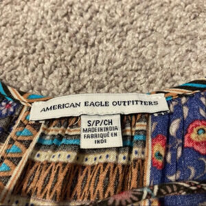 American Eagle Outfitters boho blouse in size S. Excellent pre-owned condition, has only been worn once. Deep v-neck, lace up detail with tassels, ruffle detail on sleeves and side slits on the hem. Viscose fabric is machine washable. Approximate measurements are in photos. From smoke free and pet free home.