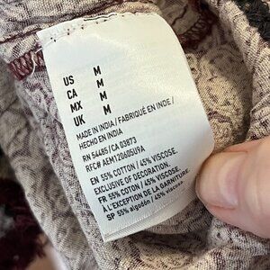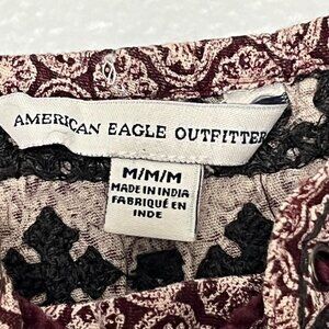 This American Eagle Outfitters romper features a bohemian design with intricate patterns in mauve and black. Ideal for casual wear or summer outings.
