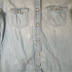 Pre-loved condition with plenty of life left. 100% cotton. Very soft and lightweight, comfortable. A couple stains, one next to button in front, one in back as pictured.