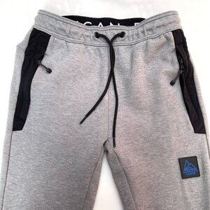 Features: gray jogger pants with elastic waist band and drawstring zipper pockets two in front one in back perfect for active wear or lounging