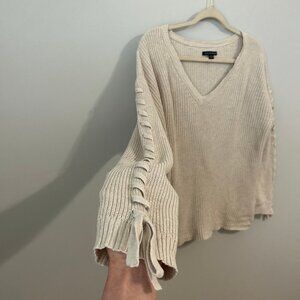 This cream V-neck sweater from American Eagle Outfitters features a cozy ribbed knit texture and a relaxed fit, perfect for everyday comfort. The long sleeves are adorned with a unique lace-up design, adding a stylish touch to this classic piece. Ideal for layering, it combines elegance with casual wearability.