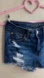 Trendy distressed jean shorts. Dark blue wash. Perfect for casual wear.