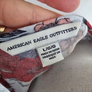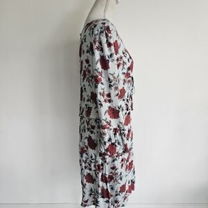 American Eagle Outfitters floral dress with ruffles, puff wrist cuff, neckline tie, and open back with button and bottom zipper.