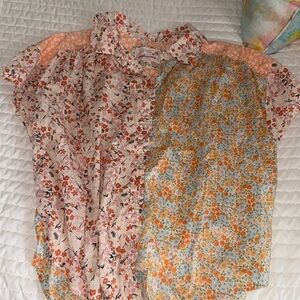 Vibrant floral patchwork shirt with button-up design. Features a blend of orange, blue, and pink flowers. Ideal for casual wear.
