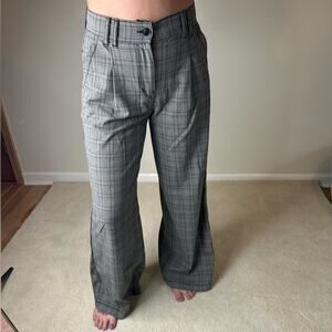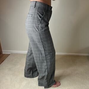 These gray wide-leg pants from American Eagle Outfitters boast a high-waisted design and a relaxed silhouette. Crafted from a woven material, they offer a sophisticated look perfect for professional settings.