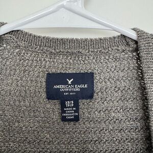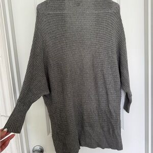 Cozy gray cardigan with open front. Features practical pockets. Ideal for layering.