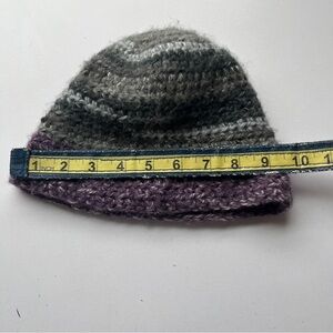 Cozy knit hat with a stylish blend of gray and purple. Perfect for chilly days.