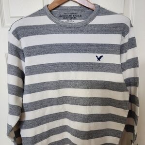This classic striped shirt features alternating light gray and darker gray stripes, creating a versatile look for casual wear. It is designed with a comfortable crew neck and made from a soft fabric blend, ensuring a cozy fit.