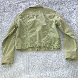 Embrace a fresh look with this green jean jacket from American Eagle Outfitters, featuring a cropped design that ends just below the waist. Crafted from durable cotton, it offers a comfortable fit with a classic shirt-style collar and long sleeves. Ideal for layering, this jacket adds a touch of casual elegance to any outfit. Measures 19” across chest, 15” shoulders, 19” shoulder to hem, 16” waist, and 23” sleeve.