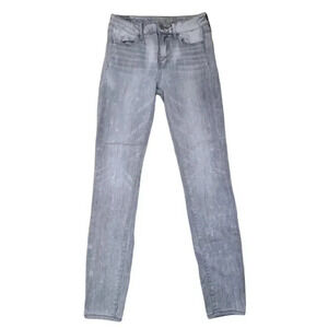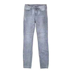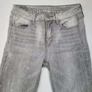 American Eagle Outfitters Hi-Rise Jegging Super Stretch Skinny Jean Gray Wash size 4. High waist, high rise skinny jean jegging. Gray wash with factory whiskering and factory water splash/splatter in the wash. 5 pocket design. Super stretch. Cotton elastane blend. In very good preowned condition.