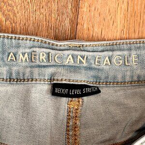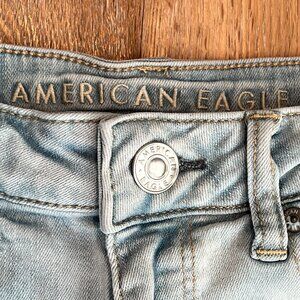 American Eagle Outfitters Hi-Rise Shortie Next Level Stretch jean shorts with rolled cuff. Light denim wash. Excellent condition - no flaws. Size 8