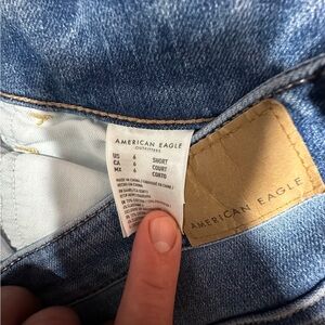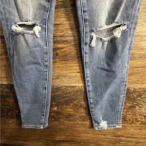 These high rise jeans from American Eagle Outfitters feature a stylish distressed design with prominent rips at the knees, offering a modern and fashionable look. The classic blue color with light fading adds a vintage touch, making them perfect for casual outings.