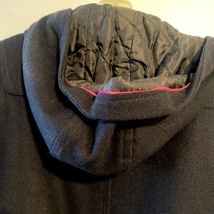 Color: Navy wool exterior, black quilted interior, with tortoise toggle buttons