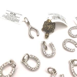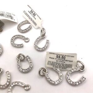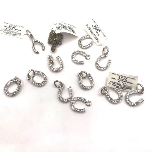 set of 13 name brand American Eagle Outfitters Charms for jewelry making, Set of silver horseshoe charms adorned with rhinestones, turtle and wishbone charms. Perfect for crafting or jewelry making.