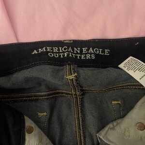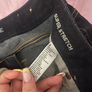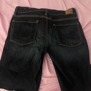 Stylish dark wash jean shorts. Classic design with frayed hem. Perfect for casual wear.