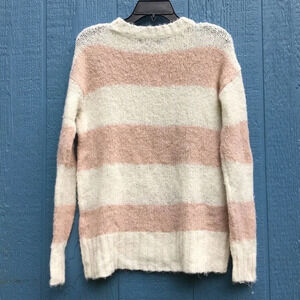 This AEO sweater features a pink/ivory stripe pattern, long sleeves and a relaxed fit.