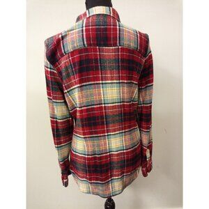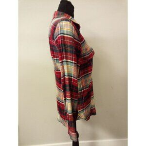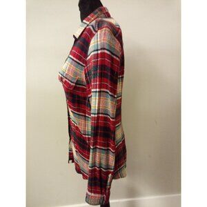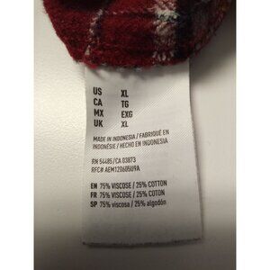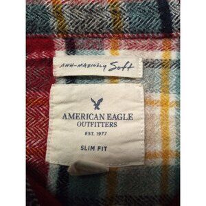 • American Eagle Outfitter Junior's Blue Yellow Button Down Shirt Plaid Collard 2 Breast Pockets Slim Fit Flannel Measurement Lying Flat Pit 2 Pit 18.5 in Shoulder 2 Hem 26.5 in 75% Viscose 25% cotton RN 54485