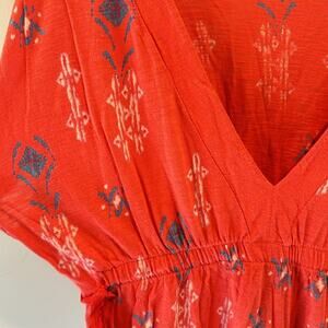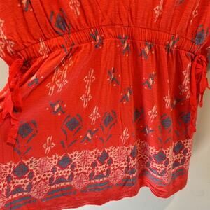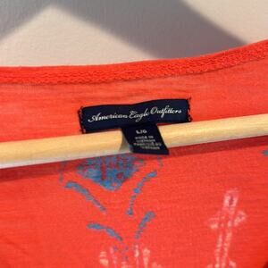 Excellent pre-owned condition, no flaws, American Eagle Outfitters size large babydoll style boho top. Vintage American Eagle Y2K piece. Coral base with deep v-neck and a tribal print with blue and white. Cinching at the waist has ribbons to tie to tighten or loosen fit as desired. Summer top for your festival or concert looks or wear to the beach with shorts over a bathing suit.