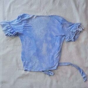 Elegant blue wrap top with ruffled sleeves. Has a hole to pull the straps through.