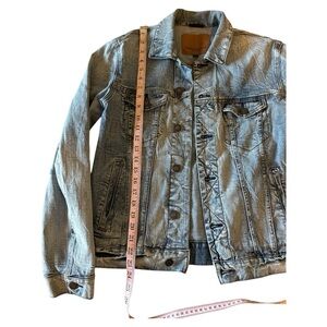 Stylish denim jacket with button front. Features classic pockets and a timeless design.