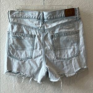 These blue jean shorts from American Eagle Outfitters showcase a high-waisted cut with heavy distressing and a raw, frayed hem, offering a trendy, vintage-inspired look.
