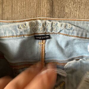 These American Eagle Outfitters skinny jeans feature a light wash with a heavily faded finish, giving them a vintage appeal. The jeans are designed with visible distressing around the thigh and knee areas, complemented by contrast stitching that enhances their stylish look.