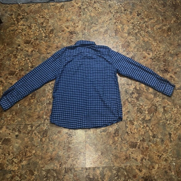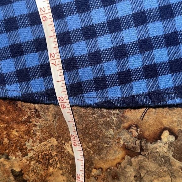 This American Eagle Outfitters men's button-up flannel shirt in size medium features a blue plaid pattern, long sleeves, and a collared neckline with a point collar style. It has a button closure and is made of cotton with a flannel fabric type. The shirt is machine washable and has accents of buttons. The fit is regular and it is a type of button-up shirt.