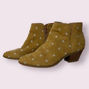 American Eagle Outfitters Metallic Star Ankle Booties. Tan suede like material with silver metallic embroidered stars. Zippers on the inside of the boots. Small heel. Very gently used, still in excellent condition. Size 9M.