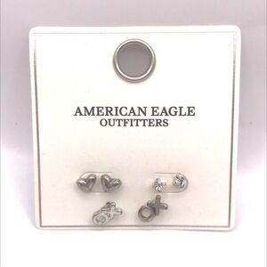 Stylish dainty minimalist silver stud earrings set by American Eagle Outfitters. Includes heart, stone, and xo symbol designs.