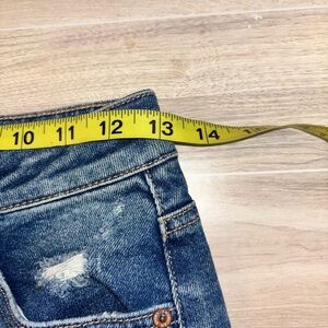 Stylish straight leg jeans. Distressed detailing. Classic blue denim.