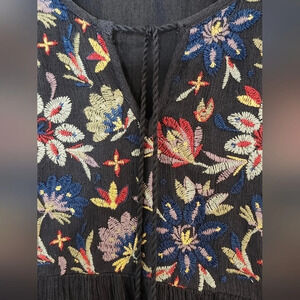 55% cotton/45% viscose, navy, floral embroidery with warm colors, 3/4 sleeves, elastic cuffs, keyhole with tie and tassels, bohemian, festival, spring