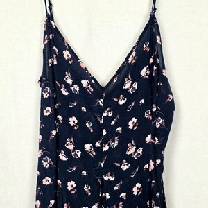 Pretty American Eagle Outfitters navy blue floral dress with a V-neckline and adjustable spaghetti straps. Lightweight and flowy 100% viscose fabric, perfect for spring or summer wear. Hidden side zipper for a flattering fit.