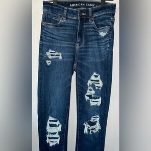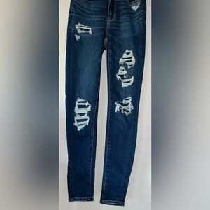 These American Eagle Outfitters skinny jeans feature a medium-dark blue wash with stylish distressing on the front, offering a modern and trendy look. The form-fitting design ensures a sleek silhouette, while the intentional rips add a touch of edgy fashion. Perfect for casual outings, these jeans combine classic denim appeal with contemporary style.