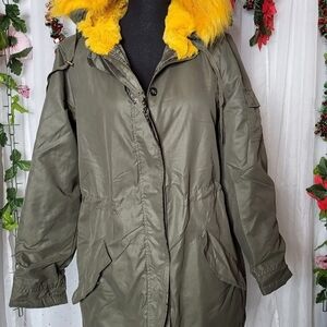 Chic olive utility jacket with a bold yellow faux fur hood. Ideal for cool weather. fur removable