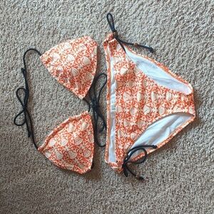 American Eagle Outfitters Orange & Cream String Bikini w Black Beaded Ties L/XL