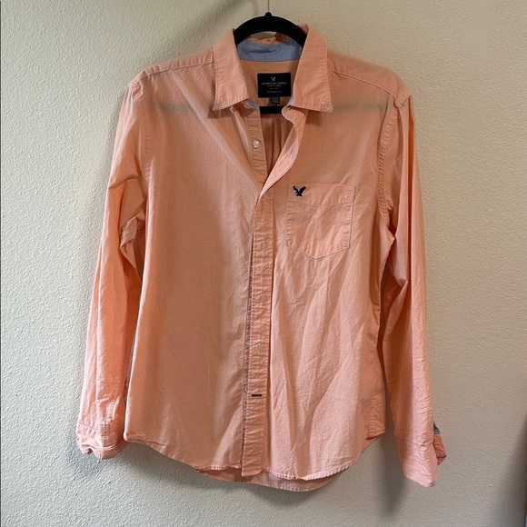 Classic American Eagle orange gingham shirt with button-up design. Features a contrasting collar. Size medium