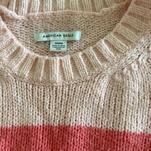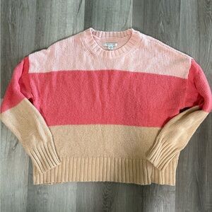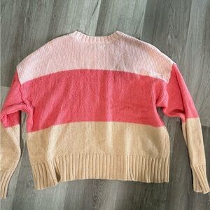 Cozy color-block sweater. Features pink and tan stripes. Perfect for casual wear.