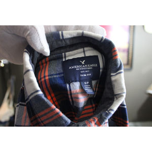 This shirt has a red, white and blue plaid in 100% cotton by American Eagle Outfitters. Marked as Slim Fit. Size Small.
