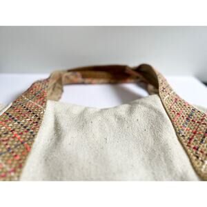 Pre-loved raffia and canvas tote in good condition with exception of ink pen markings inside one of the side pockets (see photos). Not visible from exterior. Handle is braided with brown suede accents. Magnetic clasp closure at top, zip pocket inside. Measurements when flat: