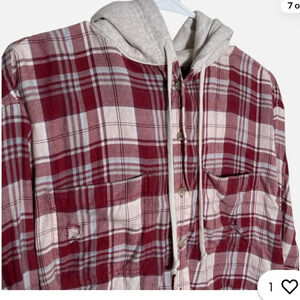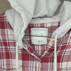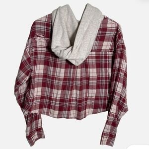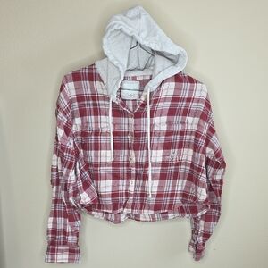 American Eagle Outfitters Red and Cream Plaid Distressed Button Up Hoodie