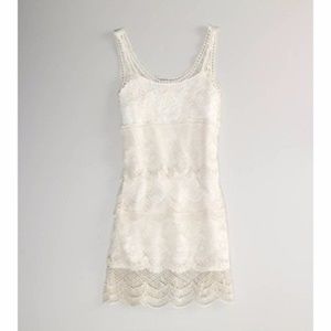 super cute lacey black dress! barely worn, crocheted lace, scoop neck & back. jersey slip