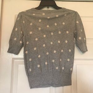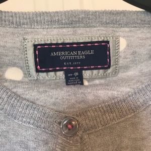American Eagle Outfitters. EUC. No damages. Gray with off-white polka dots. Sleeves hit just above elbows. Buttons down the front. Lightweight. Round neck cardigan. Preppy. Cardigan. Knit. Knitwear. Polka-dot print. Coastal grandmother. Neutral pullover knit. Fitted cardigan. Bundle multiple items for savings! Smoke free home.
