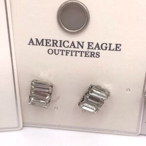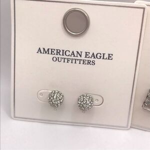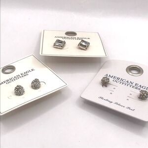 Name brand costume fashion jewelry, 3 pairs of Elegant silver tone stud earring set by American Eagle Outfitters, one pair has sterling silver post. New with tags.
