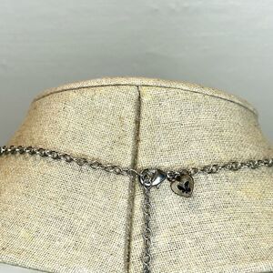 This elegant piece features a large, intricately designed filigree open work round pendant, adding a touch of sophistication to any outfit. The adjustable lobster clasp closure ensures a perfect fit, while the signed logo charm adds a signature touch. Perfect for any occasion, this necklace combines classic design with modern flair.