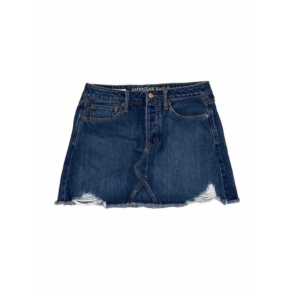 This is a distressed denim mini skirt for women from American Eagle Outfitters. It features a mid-rise waist with a zip closure and button accents. The skirt has pockets and is made of a stretchy cotton blend material. It comes in a dark wash and solid pattern. The skirt is suitable for casual occasions and can be worn in summer, fall, or spring. The brand is known for its classic American style. The skirt is available in size 6 and is machine washable.