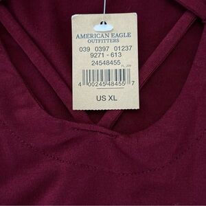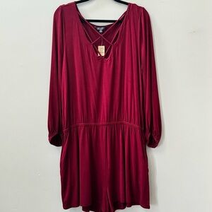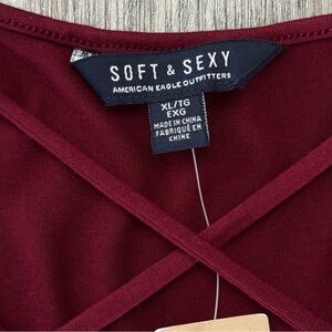 Burgundy long sleeve romper by AEO is Soft & Sexy is in like new condition. Adorable crisscross detail in the front give it a great look. Size Extra Large Viscose with 7% elastane. New with tags