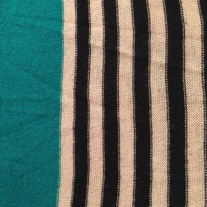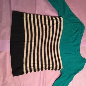 Dark turquoise color on top. Navy blue and cream stripes on bottom. Made out of nylon, wool and rayon. Quarter sleeves right past elbows.