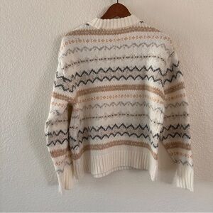 This stylish crewneck sweater from American Eagle Outfitters features a classic tan and white design, fair isle pattern, perfect for adding a touch of elegance to your wardrobe. The ribbed cuffs and hem provide a snug fit, making it an ideal choice for chilly days. Its timeless crewneck style ensures versatility for any casual occasion.