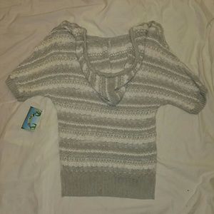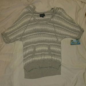 Very Comfortable with pockets short sleeve sweater can be worn over a cami it is very lightweight and has a hoodie